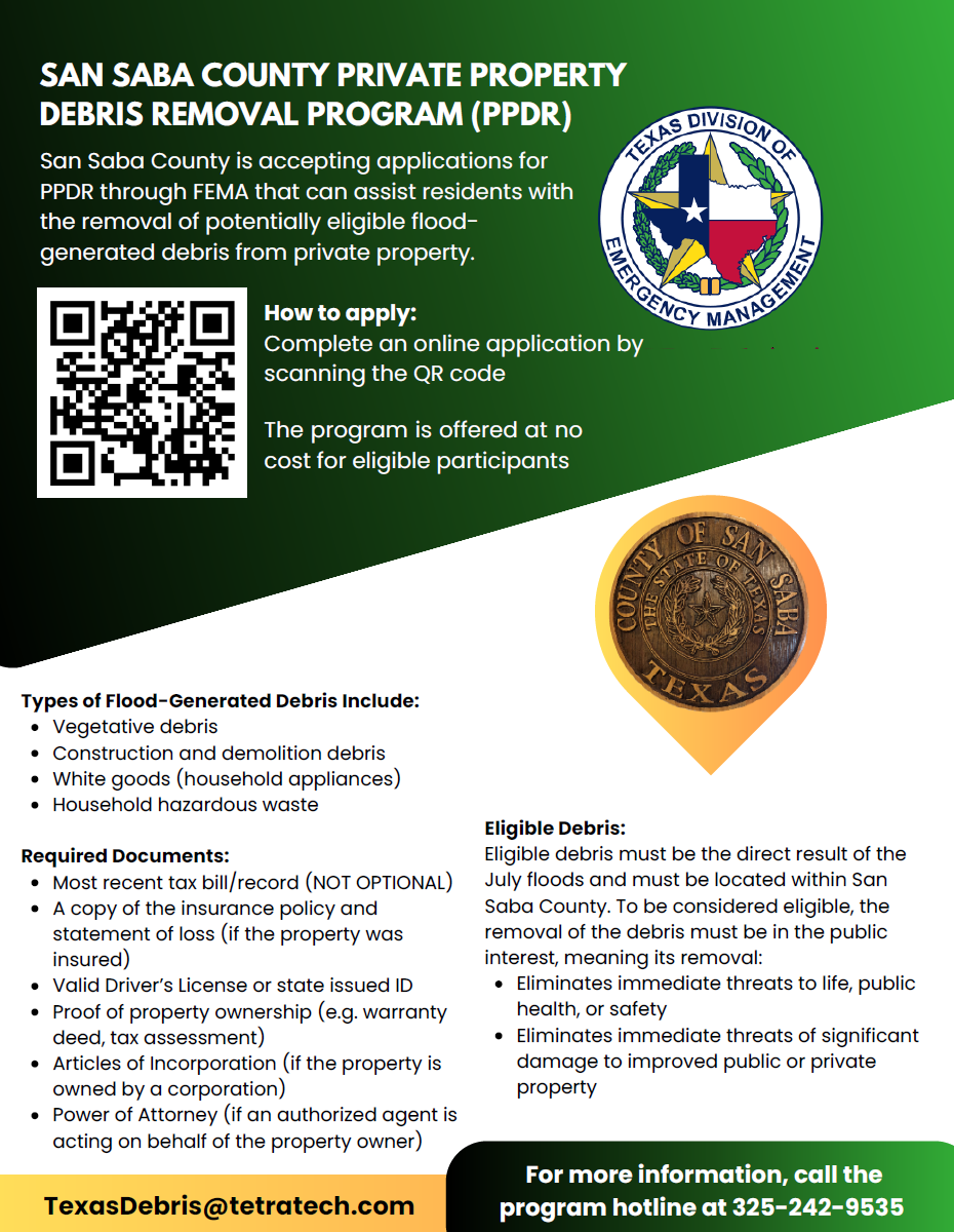 FEMA/PPDR – SAN SABA COUNTY PRIVATE PROPERTY DEBRIS REMOVAL | San Saba County is accepting applications for PPDR through FEMA that can assist residents with the removal of potentially eligible flood-generated debris from private poperty. LEARN MORE….